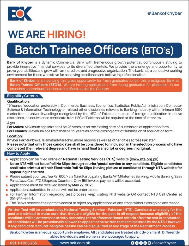 The BOK Batch Trainee Officers Program 2025 is your golden ticket to enter Pakistan’s banking sector. With nationwide postings, inclusive eligibility criteria, and professional growth opportunities, it offers everything a graduate could wish for. If you meet the criteria and have the ambition to thrive in a challenging yet rewarding field, don’t miss out. Head over to the NTS website and apply now—your future in banking begins here.